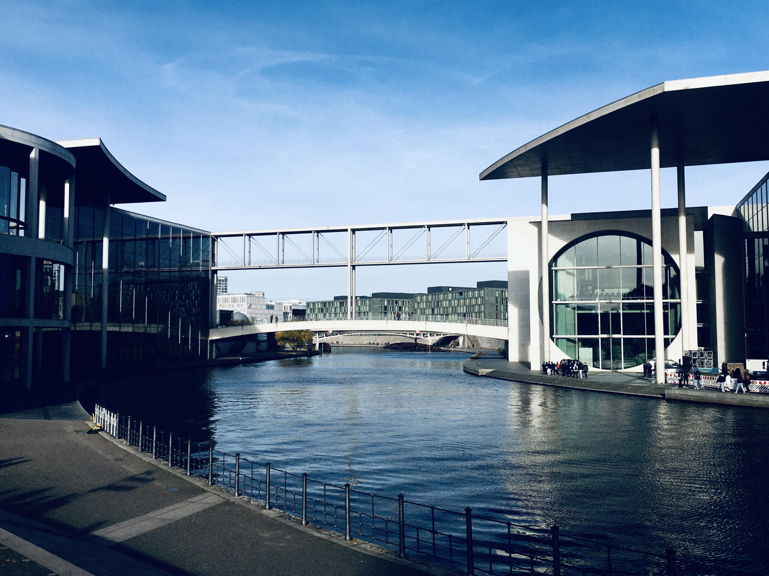 Der Jakob-Mierscheid-Steg verbindet das Paul-Löbe-Haus (links im Bild, Jargon: PLH) mit dem Marie-Elisabeth-Lüders-Haus (rechts im Bild, Jargon: MELH) und ist baulich durchaus beeindruckend: eine rund 100 Meter lange Gebäudebrücke in der sechsten Etage, nur von den beiden verbindenden Gebäuden aus begehbar, freischwebend und mit Wetterschutz. Der Steg gehört zum sogenannten Band des Bundes: einem architektonischen Ost-West-Riegel, der die Ministerien symbolisch zusammenführt.
